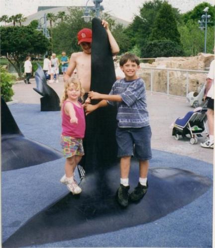 Matt, Ash and Jas posing by a shark fin, Sea World prob.