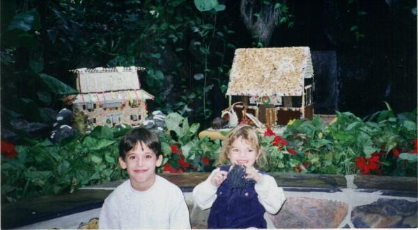 Ash and as in front of the giant gingerbread houses.