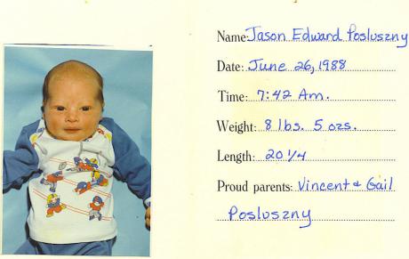 Finally about 6:30 I had to call an ambulance (dramatic). I got to the hospital just in time to give birth to Jason Edward Posluszny, born at 7:42 am. He weighed in at 8lbs, 5ozs and 20 1/4 inches long. He was beautiful. I was blessed with my 4th child, and very, very happy.