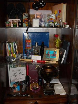 Top shelf includes the flip flops he was wearing in the crash, his 21st birthday cards, his shot glass collection, his coke glasses he was collecting as well as his baby book.