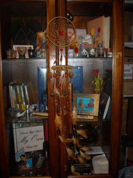 This first picture is the cabinet I bought for his things. There’s shelves with doors on the bottom to keep things I dont need to display. I keep my favorite dream catcher hanging on the front. At night the fan blows the chimes and it is very peaceful. The second is another pic with the doors open...